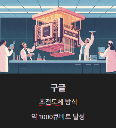 | 초전도체 방식 | 초전도체 사이에 얇은 절연층을 놓고 전압/자기장으로 큐비트 조작 | 연산속도 빠름, 연구 성과 많음 | 큐비트 불안정, 외부 간섭에 취약 | 구글, IBM |